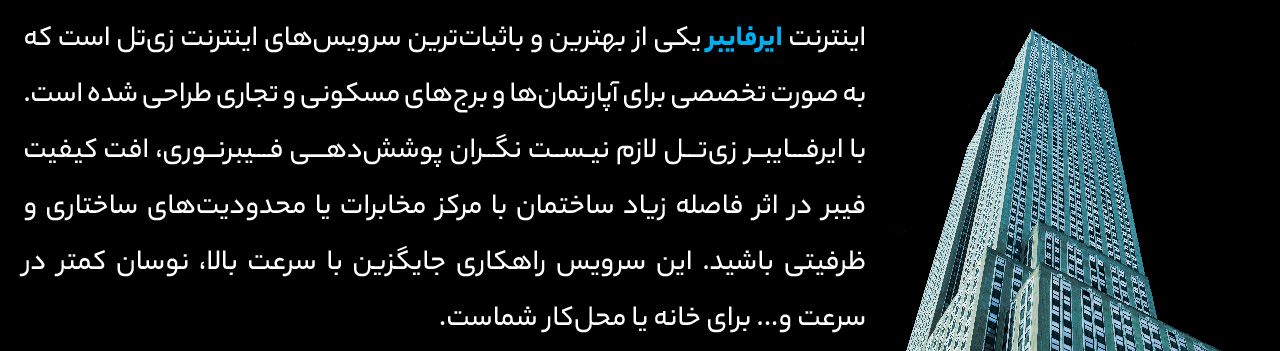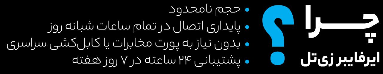 ایرفایبر یکی از سرویسهای اینترنت زیتل است که بدون نیاز به کابلکشی یا پورت مخابراتی، از طریق امواج رادیویی، اینترنت پرسرعت را به ساختمان شما میرساند.